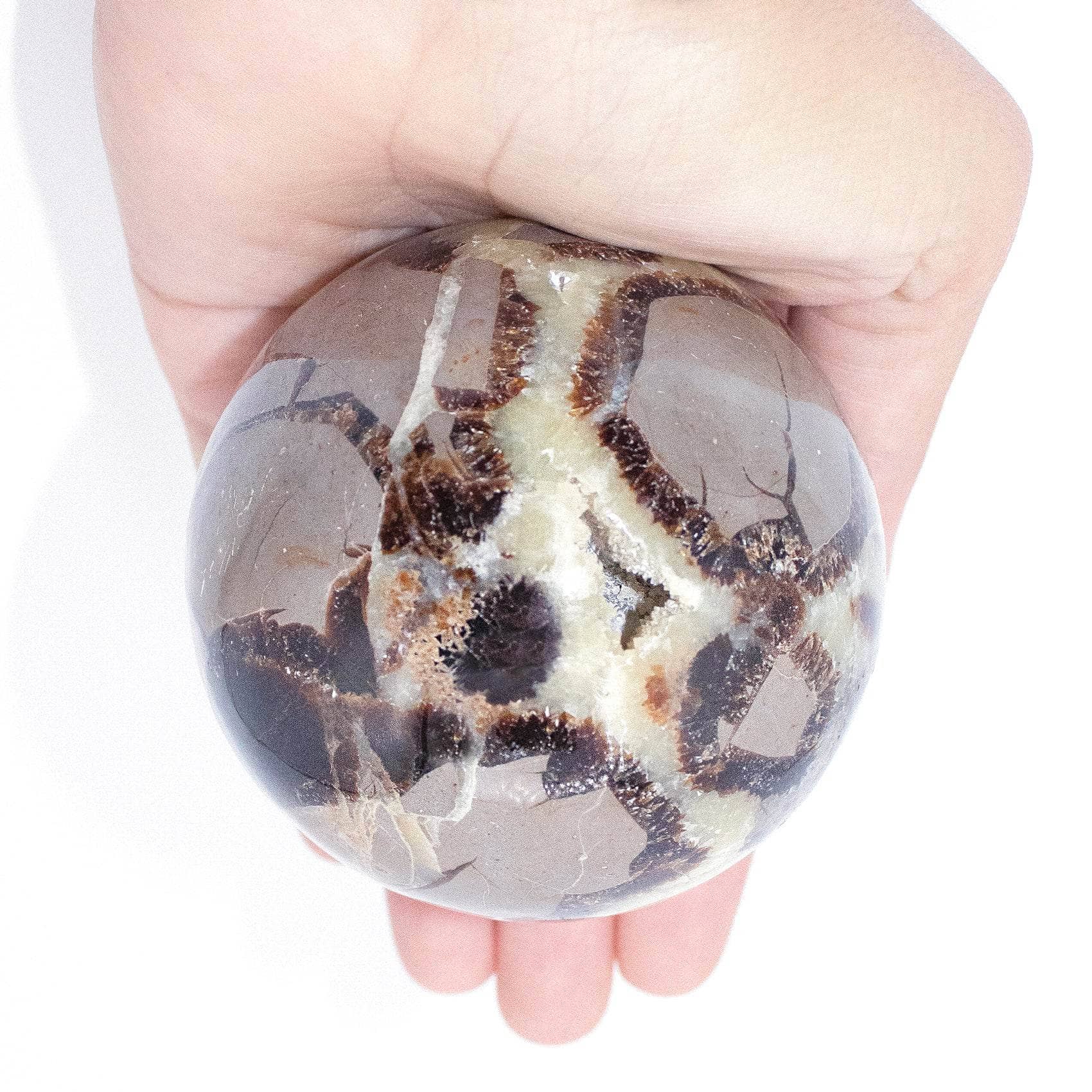 A masterpiece of nature, the Black Septarian Sphere – AAA Premium Quality radiates grounding energy and ancient wisdom. Polished to perfection, each sphere reveals striking patterns of golden calcite, brown aragonite, and gray limestone, creating a one-of-a-kind work of art that balances strength, stability, and protection.
